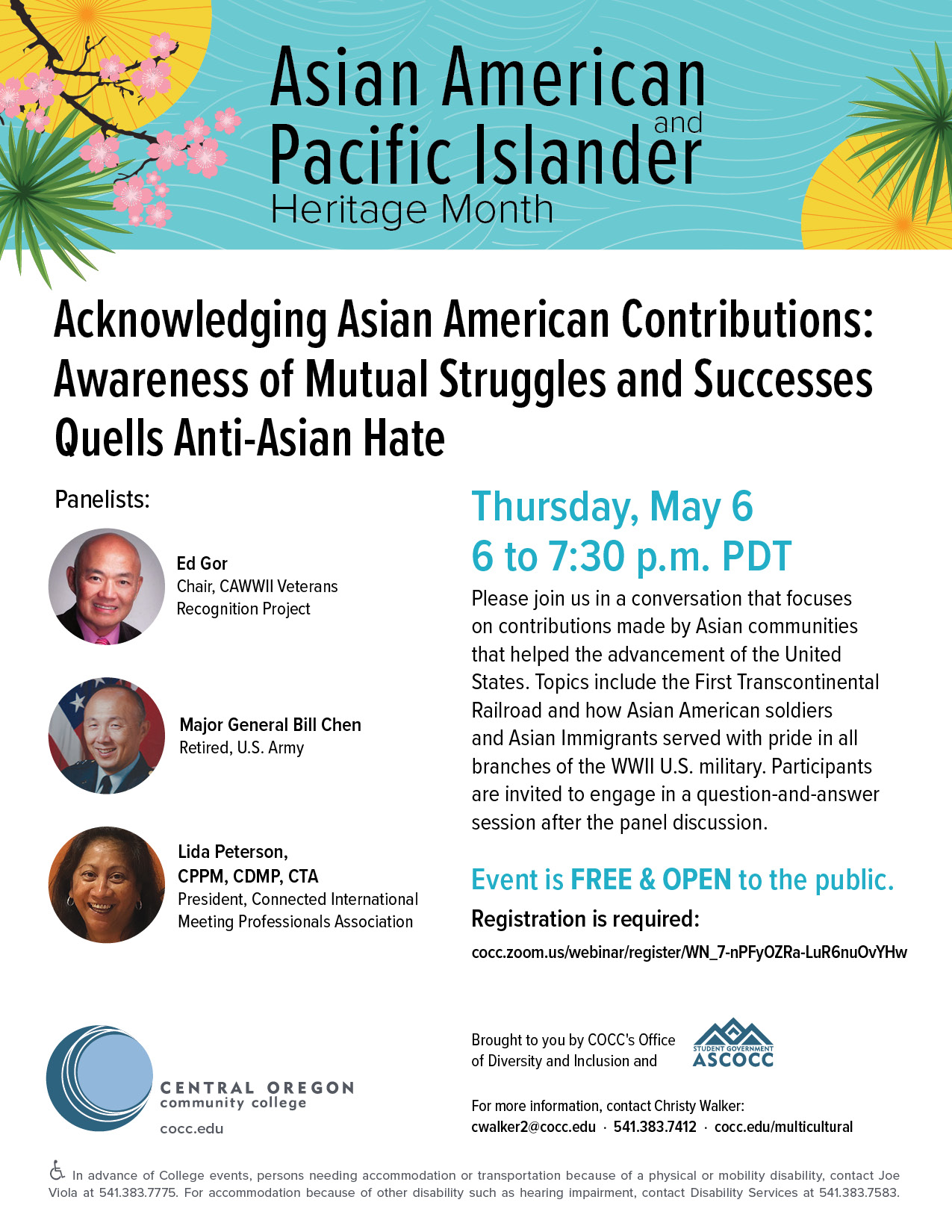 $65 – $75Please COCC in a conversation that focuses on contributions made by Asian communities that helped the advancement of the United States. Topics include the First Transcontinental Railroad and how Asian American soldiers and Asian Immigrants served with pride in all branches of the WWII U.S. military. Participants are invited to engage in a question and answer session after the panel discussion.