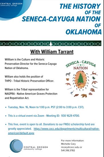- History of the Seneca-Cayuga Nation of Oklahoma with William Tarrant, Culture and Historic Preservation Director for our tribes. William will share a brief history of how these bands of Seneca and Cayuga Indians came to be in the Oklahoma territory from the upper New York area. I am proud to present this event about my tribe. Please join us for this virtual event on Tuesday, Nov. 16, 12 – 1:00pm PST, and 2:00 – 3:00pm CST. https://cocc.zoom.us/j/93016294700
