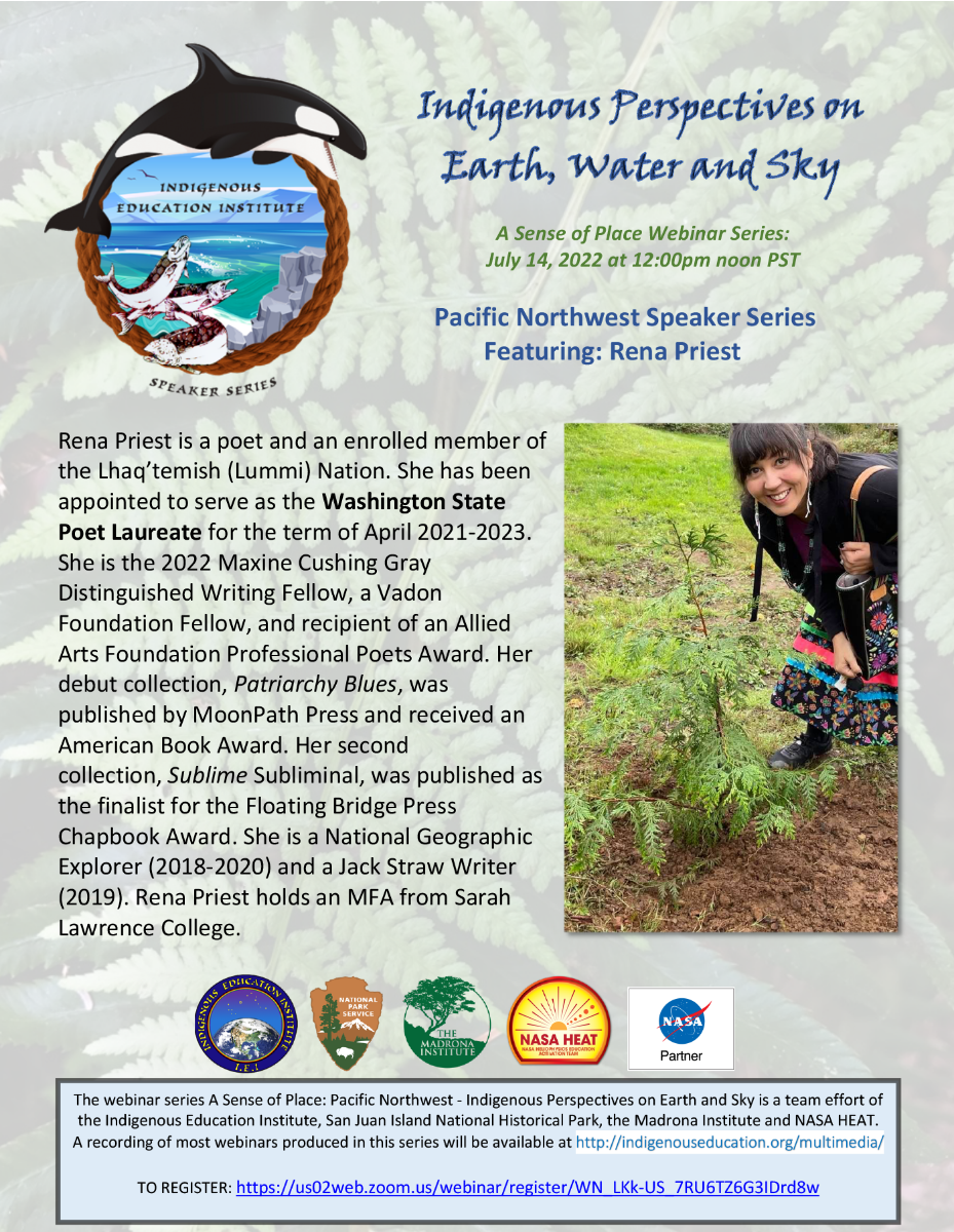 $65 – $75Register now for the webinar “A Sense of Place: Indigenous Perspectives of Earth, Water and Sky,” featuring Rena Priest, enrolled member of the Lummi Nation and Washington State Poet Laureate -Space is limited so please register now.
