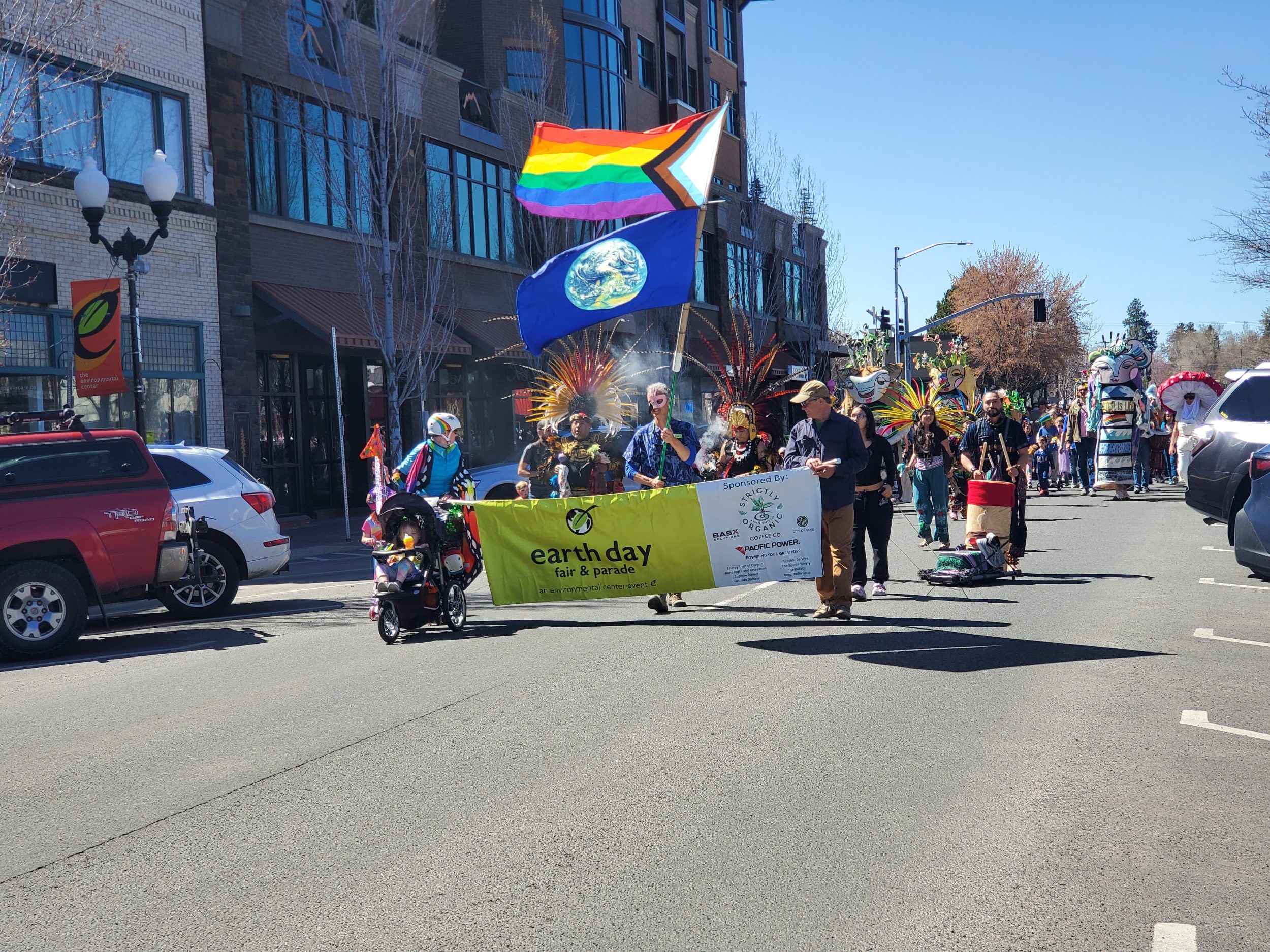 a parade travels down a street in Bend Oregon. the leader of the parade holds a flagpole with an earth flag and a LGBTQ+ pride flag, as well as a banner reading "earth day fair and parade"