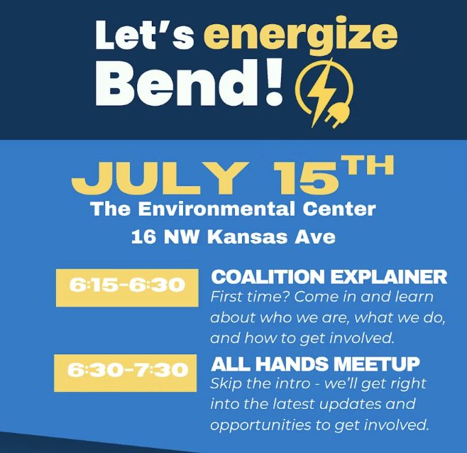 The Environmental Center 16 NW Kansas Avenue, Bend, ORFirst time around the block? Pop in early to learn the nuts and bolts of what we’re doing 🤓 We’ll get into the latest news on electrification starting at 6:30 and connect you with opportunities to get involved⚡️ The clean energy revolution is going to take all of us, we hope to see you there.…